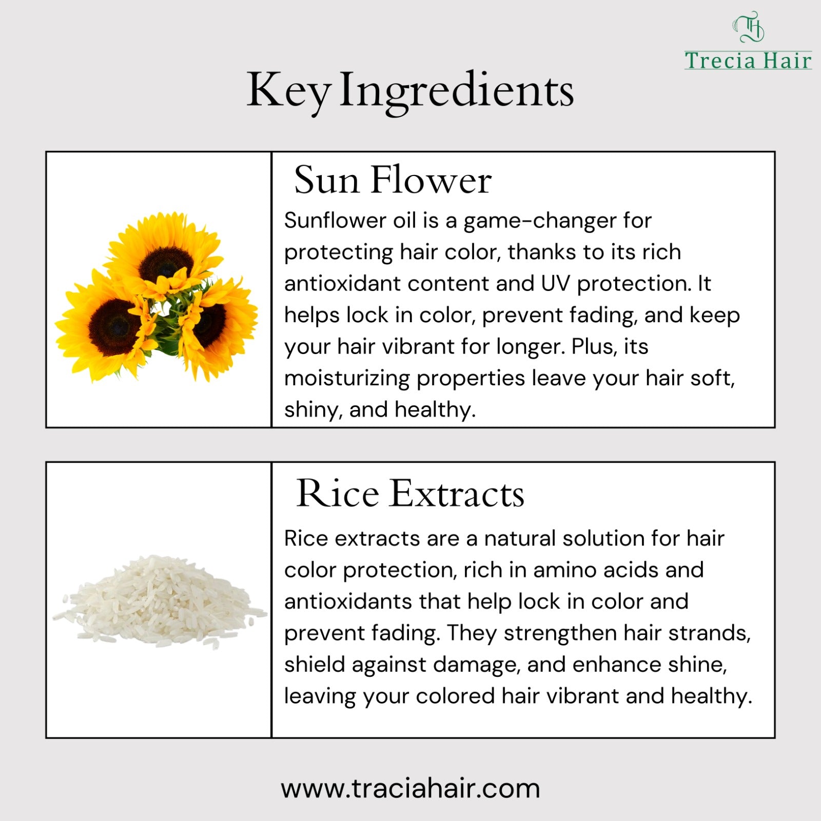 Protect and enhance your hair color with our nourishing oil blend. Infused with sunflower oil, soybean oil, coconut oil, rice extract and vitamin E, this formula locks in moisture, adds shine and shields hair from color fading